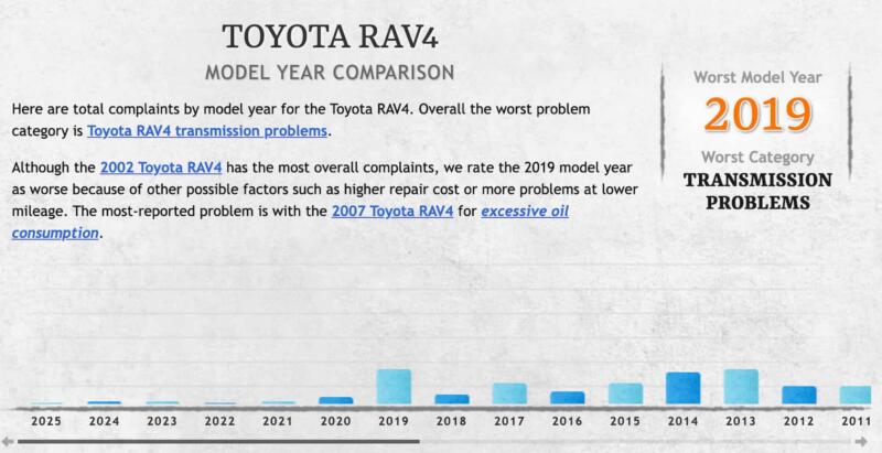 За статистикою, найбільш проблемним у технічному плані став RAV4 2019 року. Саме тоді модель перейшла до п’ятого покоління, і хоча в цілому кросовер залишився надійним, перехід із 2018-го на 2019-й виявився для нього непростим. Власники цих авто повідомляли про численні та дорогі несправності, усунення яких потребувало суттєвих витрат.