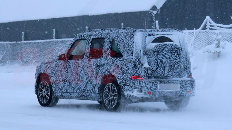 Німці готують зменшену версію моделі, яку в мережі називають mini або baby G-Wagen. Кузов тестового прототипу повністю закритий камуфляжем, але видно фірмову “квадратну” форму з коротким носом, круглими фарами та рубаним силуетом. Корма нагадує старший G-Class, хоча запаска на прототипі виглядає занадто великою.