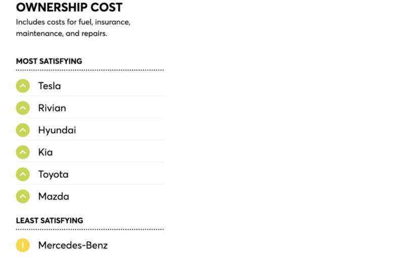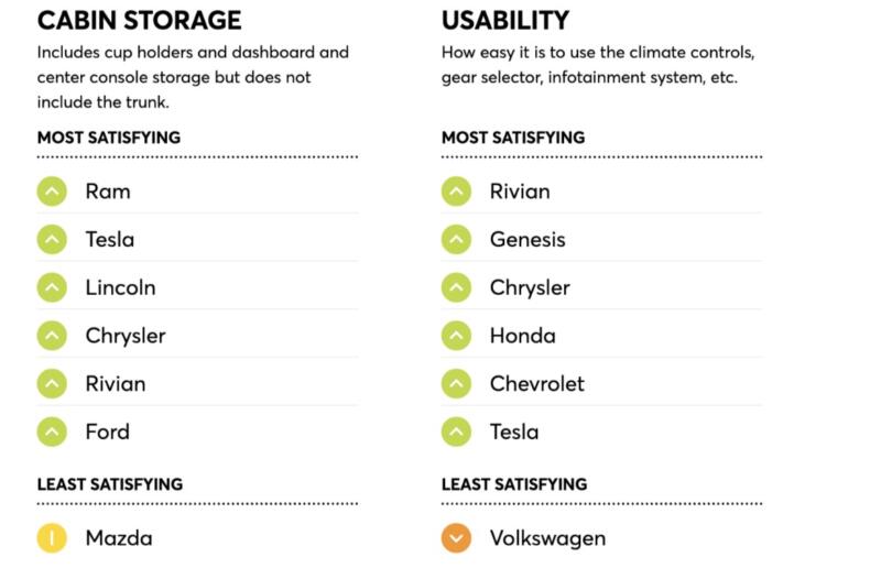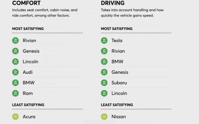 За даними опитувань Consumer Reports, лідером за відчуттями від водіння стала Tesla. Друге місце посідає Rivian, а третє — BMW. Водночас за комфортом лідирують Rivian Genesis і Lincoln, а Tesla до топу не потрапила. Останнє місце в рейтингу, що оцінює відчуття від водіння, посідає Nissan, а за комфортом — Acura.