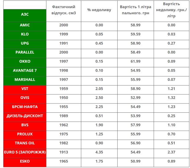 До “зеленого списку” увійшли мережі, що дотримуються правил або навіть трохи переливають бензину – це AMIC, PARALLEL, KLO, AVANTAGE 7, ОККО та MARSHALL. У “червоному списку” опинилися BVS, БРСМ-НАФТА, OVIS у Харкові, EURO 5 у Запоріжжі та низка невеликих заправок – ДИЗЕЛЬ-ДИСКОНТ, PROLUX, TRANS OIL і ESKO. Абсолютним антирекордсменом стала EURO 5 у Запоріжжі, де клієнти недоотримують близько 5% пального, що еквівалентно втраті понад двох гривень з кожного літра. У OVIS і БРСМ недолив становить близько 1,2-1,3 грн за літр.