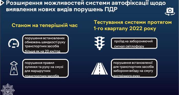 У першому кварталі 2022 року поліція планує запустити тестування системи автоматичної фіксації на такі порушення ПДР, як проїзд на заборонний сигнал світлофору та порушення встановленої для транспортних засобів заборони виїзду на смугу зустрічного руху.